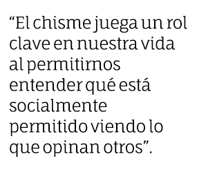 El chisme juega un rol clave en nuestra vida social. Nos ayuda a entender qué está socialmente permitido viendo lo que opinan otros, puede funcionar para mantener las reglas sociales y, por sobre todo, nos puede divertir mucho. Hay que consumirlo en moderación, para no ser el chismoso que no puede guardar ningún secreto, ni generar ambientes opresivos en los que cualquier diferencia es penada. Pero, dentro de los límites, es una parte esencial de nuestras relaciones sociales, y los necesitamos tanto como el humor.
