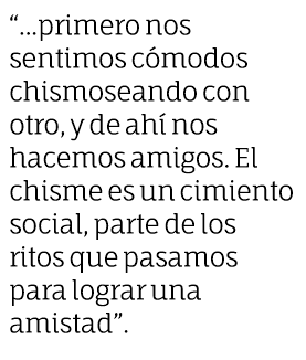 El chisme es una parte básica de nuestras relaciones sociales. Hablar sobre otros, que no están presentes en ese momento, para bien o para mal, es una de las actividades que nos ayudan a construir vínculos.