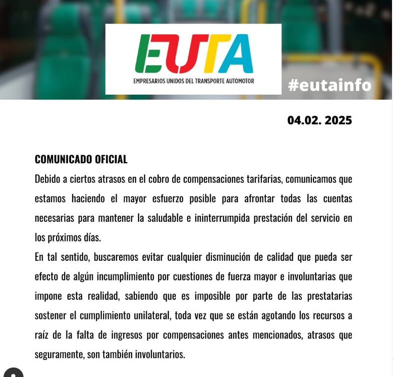La Asociación de Empresarios Unidos del Transporte Automotor (EUTA) emitió un comunicado en el que amenazó con reducir el servicio de transporte público en Posadas, debido a presuntos atrasos en el cobro de compensaciones tarifarias (subsidios).