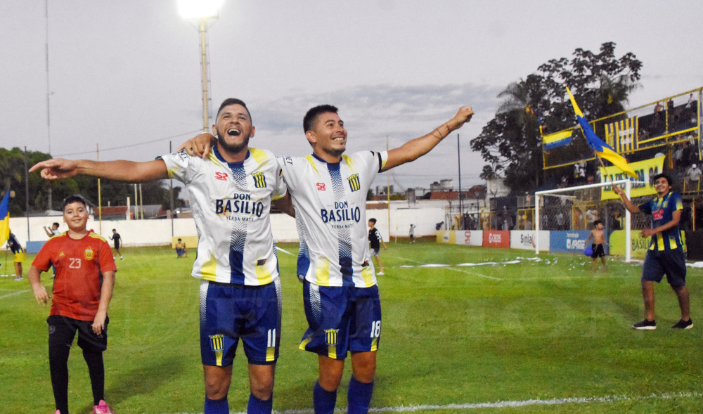 GOLEADORES. Ulises Silveira (izquierda) y Mauro Gómez festejan el pase de Mitre a la finalísima. El artillero marcó 6 goles en los últimos tres partidos.