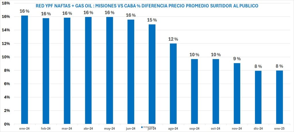 El cuadro refleja para la red de YPF, en los productos nafta más gasoil, la diferencia de Misiones con la Ciudad Autónoma de Buenos Aires, en el precio promedio del surtidor al público, e indica que en enero de 2024 había una brecha de 16%, quiere decir que un misionero pagaba 16 pesos más por cada 100 pesos que un porteño.