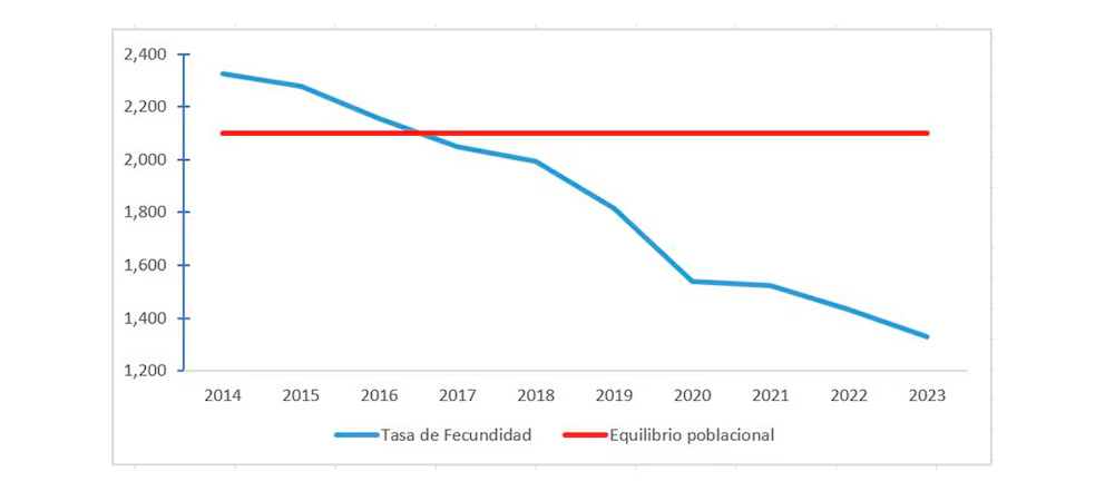 La tasa de fecundidad en 2023 fue de 1,33 hijos por mujer, un número muy por debajo del umbral de reemplazo generacional, fijado en 2,1 hijos por mujer. “Por debajo de ese límite, un país o región se va despoblando. Eso es lo que viene sucediendo ininterrumpidamente en todos los distritos y, consecuentemente, también a nivel nacional”, advierte Del Río.