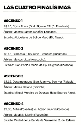 La finalísima entre misioneros y cordobeses se cumplirá a partir de las 19.30, en el estadio Ciudad de La Banda de Santiago del Estero, sede del Club Sarmiento. El árbitro encargado de impartir justicia será el tucumano Mauricio Martín.