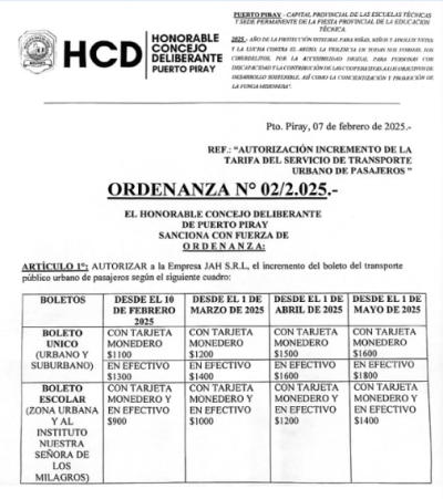 Los concejales presentes (Smith, Melgarejo, Giménez y Mercado) acordaron que el aumento será gradual: el ajuste comenzará este mismo mes de febrero cuando el boleto único con tarjeta pase a valer $1.100 y $1.300 sin ella. Los ajustes se extenderán hasta mayo de este año inclusive.