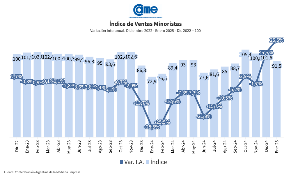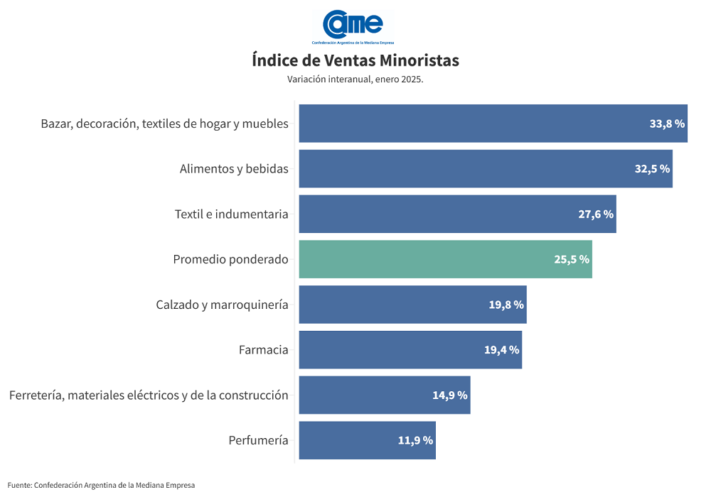 Este aumento registrado en el primer mes del año demuestra una recuperación del comercio minorista, iniciada en diciembre de 2024, según evalúan desde la Cámara Argentina de la Mediana Empresa (CAME), autora del informe.