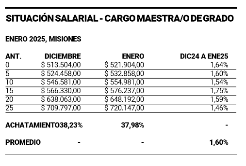 Un día antes de la reunión, el Frente de Trabajadores de la Educación en Lucha (FTEL) y la UDNAM difundieron en sus redes sociales un informe en el que advierten sobre la caída del poder adquisitivo de los docentes misioneros en 2024.
