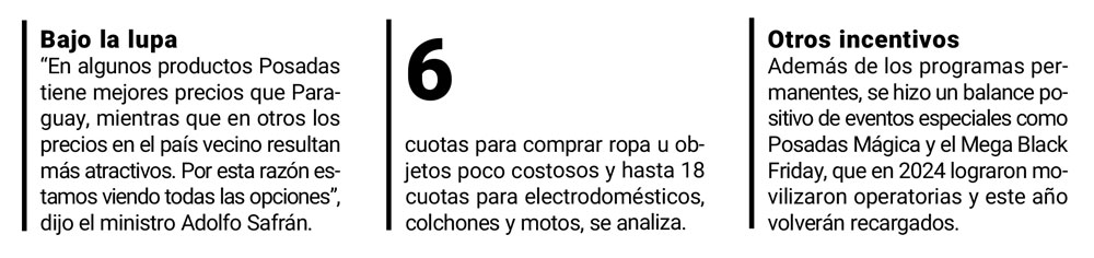 “Analizamos implementar una reformulación en los programas ‘Ahora Misiones’, ‘Ahora Bienes Durables’, ‘Ahora Neumáticos’ y ‘Ahora Construcción’; que son las herramientas que más ventas generan mensualmente. Estamos viendo en perspectiva los rubros que están más complicados ante la competencia con los países vecinos. Por esa razón se ajustará el programa ‘Ahora Misiones’ de tal modo de dar menos cuotas, pero con un mayor reintegro. En la práctica mucha gente no justifica comprar una prenda de vestir en 12 cuotas, porque les resulta un mal negocio. Lo que se pretende es que para estos rubros se achique el plazo a 6 cuotas, pero sin interés y con mucho más reintegro, ahí sí se compite mejor”, explicó a este Diario el ministro de Hacienda, Adolfo Safrán.