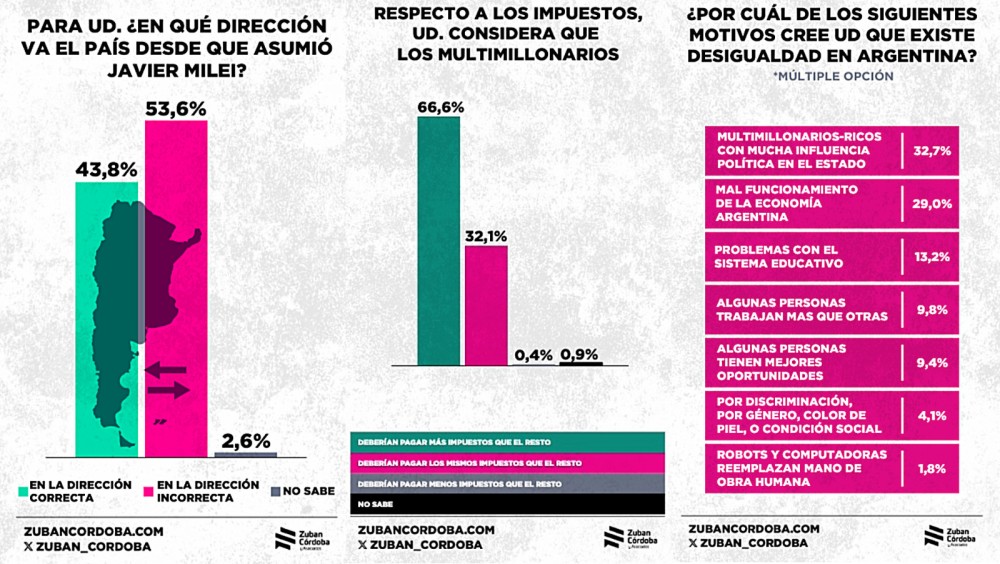 Mientras que más de la mitad de los encuestados cuestiona el rumbo de las medidas tomadas por la administración libertaria, un 53,3% sostiene que el mandatario “gobierna para los multimillonarios”.