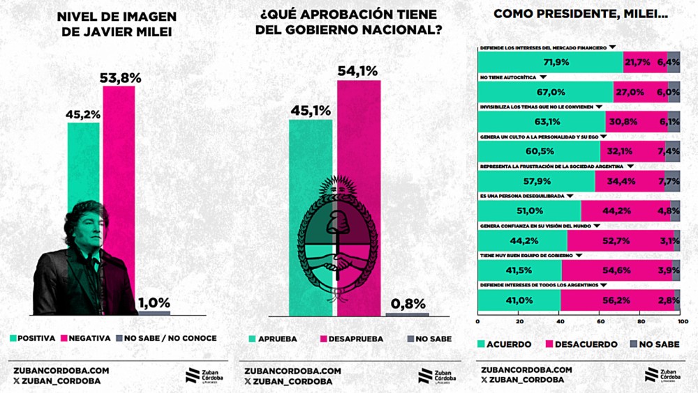 Entre los datos recolectados, también se observa que un 53,8% de los argentinos tiene una imagen negativa de Milei, mientras que solo el 45,2% lo ve de manera positiva.