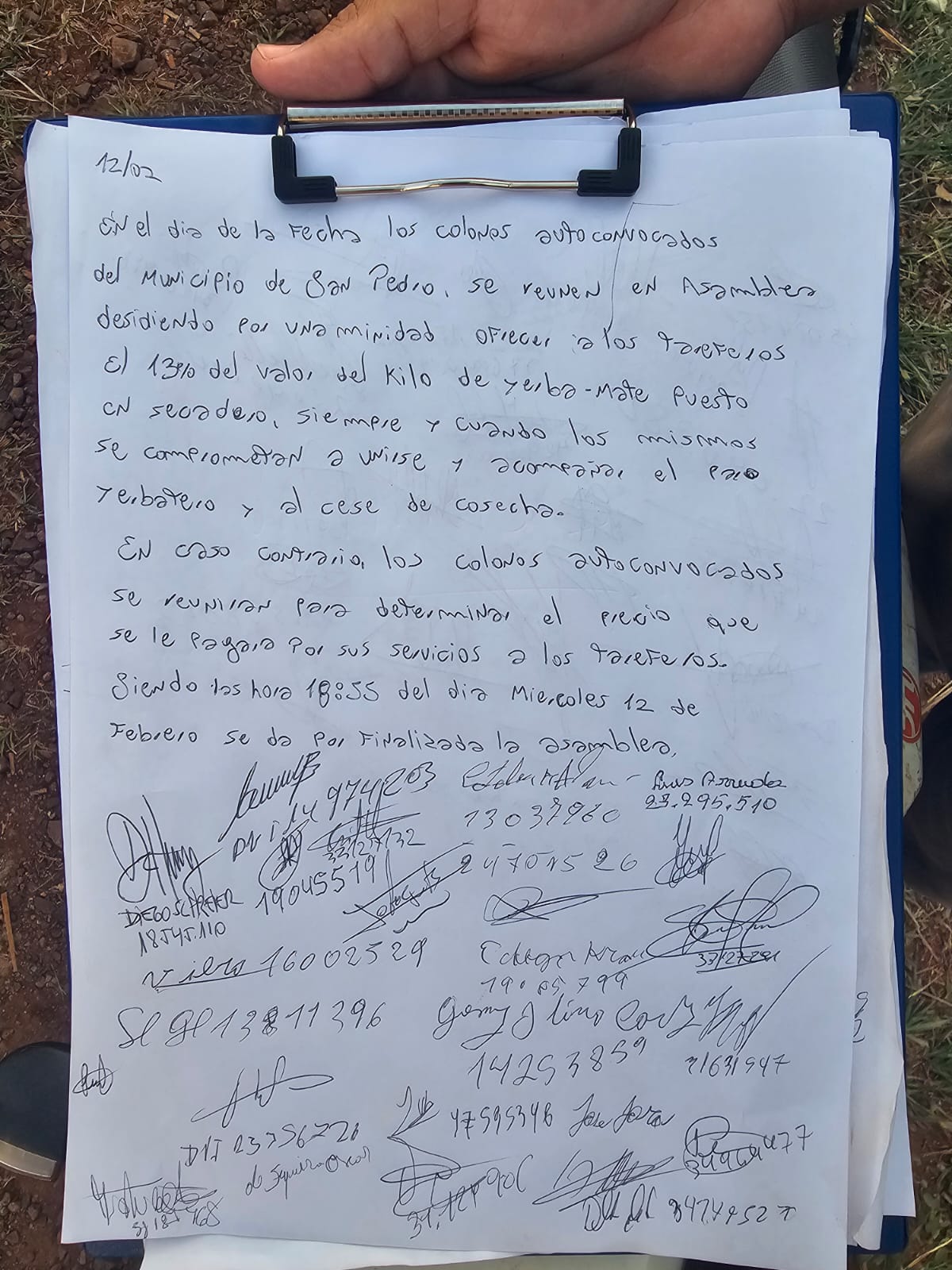 El documento firmado por los productores establece que, en caso de que los tareferos no adhieran a la protesta, se convocará a una nueva reunión para redefinir el monto a pagar por sus servicios.