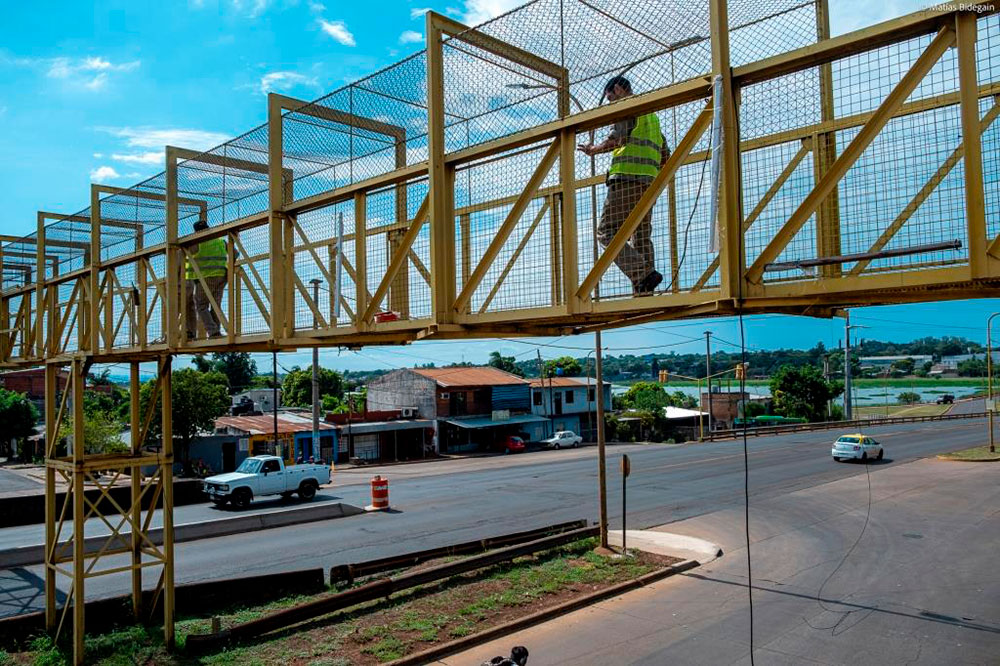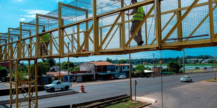En Posadas durante la mañana de este viernes 14 de febrero, un equipo técnico de la la Dirección Provincial de Vialidad (DPV) realiza trabajos de mantenimiento en la estructura metálica del puente peatonal que atraviesa Ruta Nacional 12, calzada principal de la Travesía Urbana Posadas – Garupá, a la altura del arroyo El Zaimán, en el Barrio San Rosa, frente al NENI 2045.