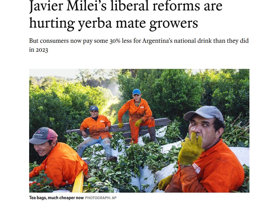 The Economist, uno de los diarios de economía más importantes del mundo, destacó la crisis que atraviesan los productores de yerba mate en Argentina tras la desregulación del sector. Según el artículo del medio estadounidense, la medida implementada por el Gobierno en diciembre de 2023 puso fin a la fijación de precios mínimos por parte del Instituto Nacional de la Yerba Mate (INYM), lo que provocó una caída de más del 50% en el valor que reciben los productores.