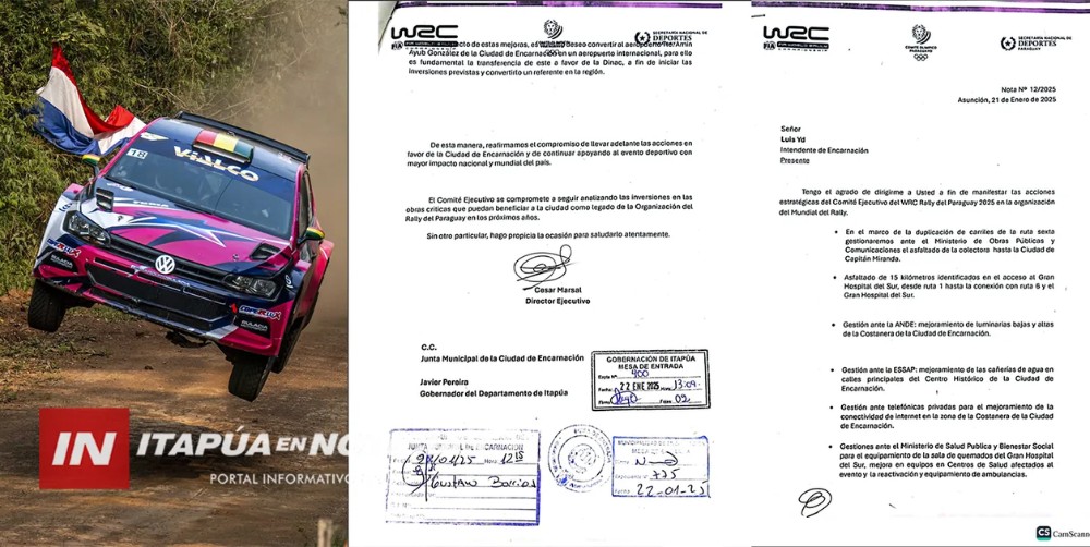 El Mundial de Rally Paraguay (WRC) se llevará a cabo del 28 al 31 de agosto en varias ciudades de Itapúa y se espera la presencia de entre 250.000 y 300.000 personas, incluyendo fanáticos locales, turistas y escuderías internacionales. La competencia representa una oportunidad económica importante para Encarnación y la región, con empresarios interesados en desarrollar una ruta aérea entre Asunción y Encarnación mediante vuelos de taxi aéreo.