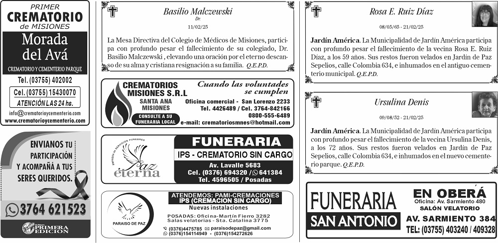 • Fúnebres del viernes 21 de febrero de 2025