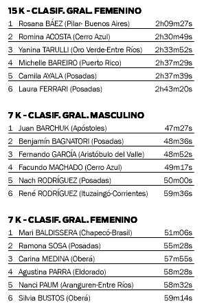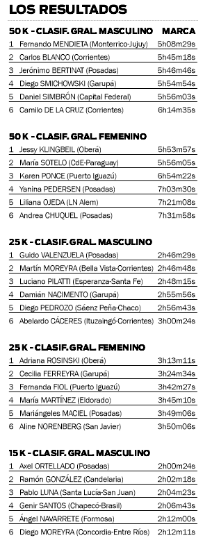 Respecto a la prueba de 25 kilómetros, entre los varones se impuso el posadeño Guido Valenzuela, mientras que entre las chicas ganó la obereña Adriana Rosinski. Además, en los 15k ganaron el posadeño Axel Ortellado y la pilarense Rosana Báez. Finalmente, en 7k, el apostoleño Juan Barchuk se impuso entre los caballeros, mientras que la brasileña Mari Baldissera ganó entre las mujeres.
