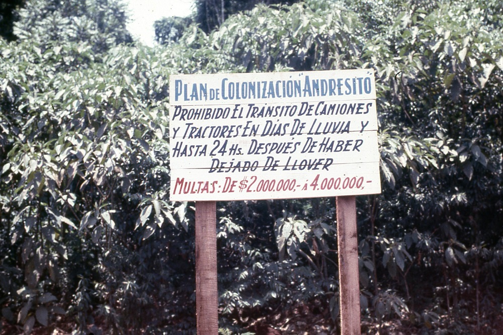 En los primeros años del Plan de Colonización Andresito, este cartel era una de las tantas señales que regían la vida cotidiana en la colonia. Se prohibía la circulación de vehículos durante los días de lluvia y barro, y quienes infringían la norma ¡eran multados! Uno de los primeros en pagar la multa fue Don José, quien tuvo que llevar al pueblo, en su tractor, a unos de sus hijos que estaba enfermo. Esta vivencia está plasmada en el Facebook “Andresito: una historia, mil relatos”, desde donde se agradece el testimonio de quienes suman sus voces “para que podamos preservar el legado”.