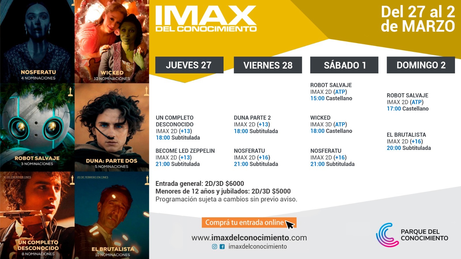 La entrada general tiene un valor de $6.000; menores de 12 años y jubilados pagan $5.000. Se pueden adquirir en parquedelconocimiento.com o por medio de la app del IMAX.