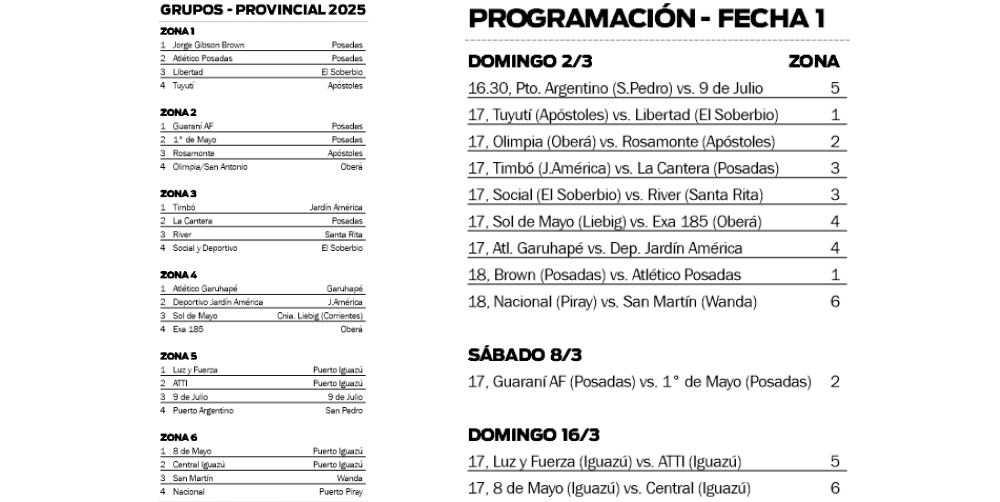 Ese día, el telón se abrirá en San Pedro, donde Puerto Argentino recibirá a 9 de Julio desde las 16.30, por la Zona 5. Luego habrá partidos en Apóstoles, Oberá, Jardín América, El Soberbio, Garuhapé, Posadas, Puerto Piray e incluso en la localidad correntina de Colonia Liebig, donde Sol de Mayo recibirá a Exa 185 de Oberá.