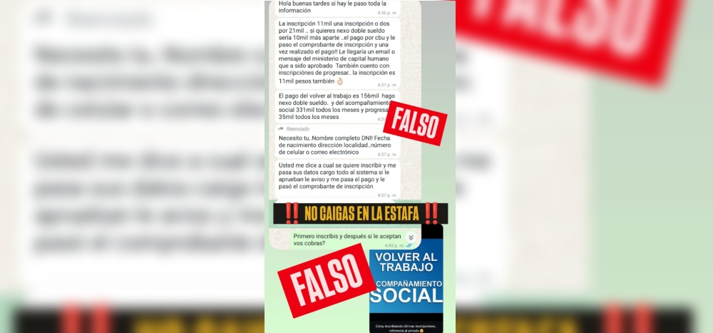Franco insistió en que las personas no brinden sus datos personales ni envíen dinero: “El ‘Volver al Trabajo’ no tiene registro, con lo cual cualquier ofrecimiento es de cumplimiento imposible y sumado a eso, nunca pueden ser pagos”.