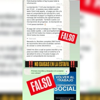 Al respecto de quienes están detrás de esto contó: “Estos estafadores evidentemente no viven en la provincia de Misiones, operan desde Buenos Aires, aparentemente, pero sí utilizan un número de teléfono con prefijo y con WhatsApp de Misiones”. Explicó que “se infiltran en los grupos de WhatsApp, que sabemos que en Misiones hay muchos de todo tipo: de compraventa, de permuta, de aviso clasificado, de bolsa de trabajo, en fin. Y allí promueven este ofrecimiento de incluirlo en el programa Volver al Trabajo y otros más a cambio de una suma de dinero”.