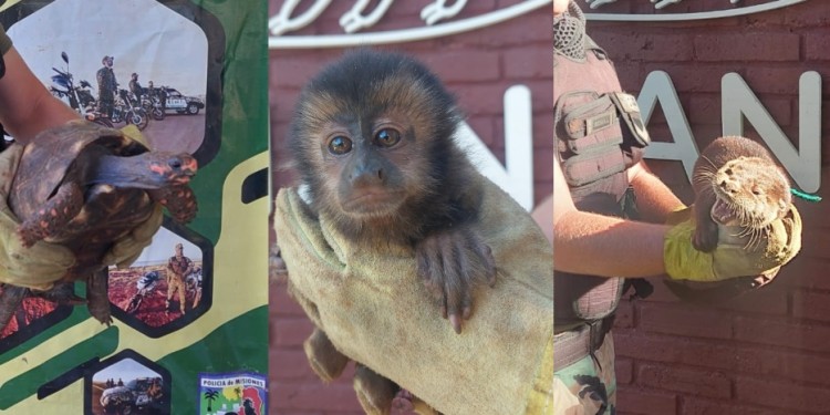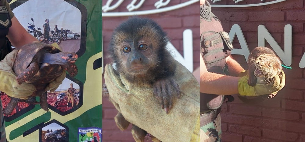 Agentes de la Dirección de Defensa del Medio Ambiente de la Policía de Misiones rescataron a un mono caí, una tortuga pata roja y un lobo de río.