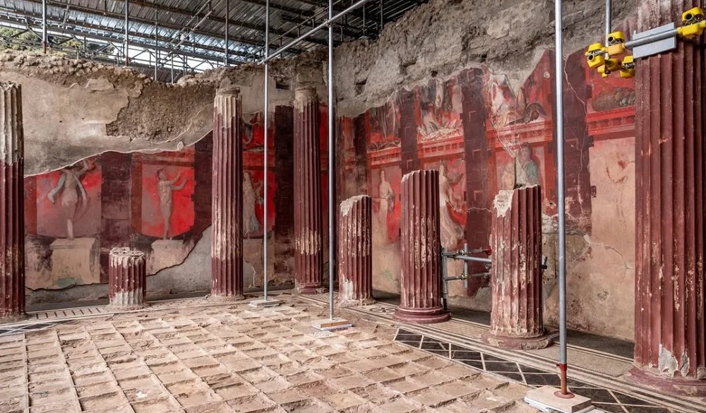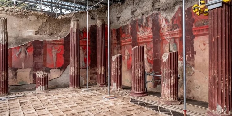 Pompeya cuenta con infinidad de frescos en las casas que se han ido excavando de entre la ceniza y la tierra pero este es un caso raro de mural gigante, de “megalografía”, la segunda junto con otro fresco encontrado en la conocida como Casa de los Misterios.