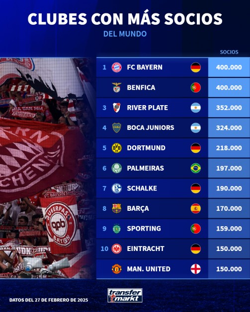 Los bávaros y los lisboetas tienen, según ese informe, nada menos que 400 mil socios cada uno, mientras que el “Millonario” argentino cuenta con 352 mil y el “Xeneize” con 324 mil, por lo que ocupan el tercer y el cuarto puesto de la lista, respectivamente.