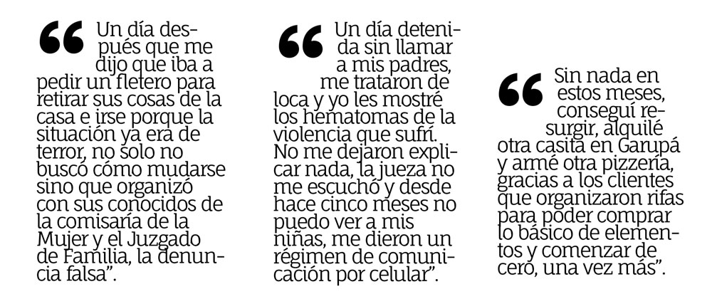 “Horas antes llevó a las niñas a la casa de sus padres, yo no sospeché nada malo, creí que iba a cumplir lo hablado, se iba a ir sin que ellas lo vieran hacerlo. Por eso fui rápido a la comisaría a denunciar todo y me esposaron a mi, no me escucharon y solo me dijeron que me iban a dar una orden de restricción, que no podía volver a mi casa y que mis hijas se iban a quedar ahí con el padre. La excluida fui yo”. “Pasé un día detenida sin llamar a mis padres, me trataron de loca y yo les mostré los hematomas de la violencia que sufrí. No me dejaron explicar nada, la jueza no me escuchó y desde hace cinco meses no puedo ver a mis niñas, me dieron un régimen de comunicación por celular. Desde entonces reclamo la tenencia o al menos un régimen de visitas, además del divorcio para que me devuelvan la casa”. “‘Te ganaron de mano’ me llegaron a decir en la comisaría de Garupá”.