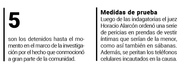 El primer sospechoso en ser capturado fue un joven de 23 años que sería expareja de la adolescente, otro de la misma edad y uno de 27, además de un cuarto de 50. La quinta sospechosa, capturada en el barrio Caballeriza (también de la Capital del Monte), tiene 22 años y se cree pudo haber presenciado e incluso filmado lo sucedido. En ese sentido, se informó que la progenitora de la víctima habría entregado a la Justicia dos videos que serán peritados.