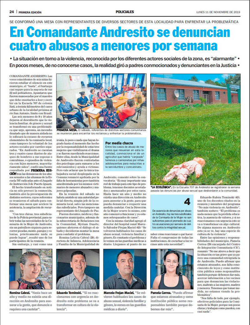 Fueron seis menores de 9 y 10 años quienes dejaron al descubierto que la violencia familiar, de género y sexual se transformó en una problemática. “En Andresito se cuentan tres y cuatro casos diarios de ataques de hombres a sus esposas o concubinas, o episodios de violencia con hijos menores, mayoritariamente niños”, confió en noviembre de 2019 una fuente a este Diario tras las denuncias de los abusos sexuales. La noticia no solo provocó la conmoción, también alzó la preocupación de distintos referentes que conformaron una mesa para acelerar asistencia y recursos.