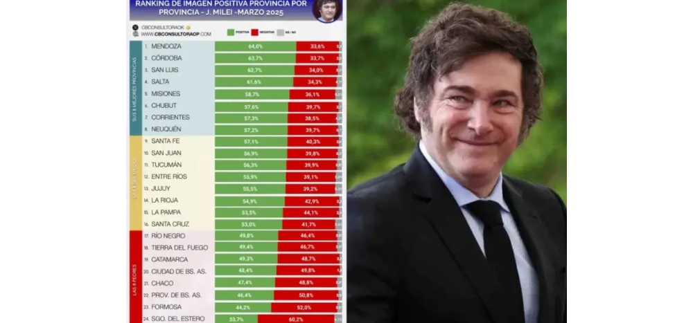 El presidente Milei registra su mayor apoyo en Mendoza, con un 64% de imagen positiva, seguido por Córdoba con un 63,7%, y San Luis con un 62,7%. Además, en Córdoba y Mendoza, la imagen positiva de Milei supera a la de Kirchner por más de 40 puntos.
