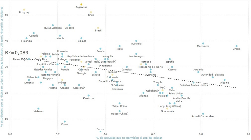 Los resultados de PISA muestran una relación negativa entre la distracción por el uso de dispositivos digitales en clase y el desempeño en Matemática: los países con más estudiantes distraídos tienden a obtener puntajes más bajos. Argentina (54%), Uruguay (52%) y Chile (51%) tienen los niveles más altos de distracción y desempeños relativamente bajos, mientras que Japón (5%) y Corea del Sur (9%) presentan baja distracción y altos puntajes en Matemática.