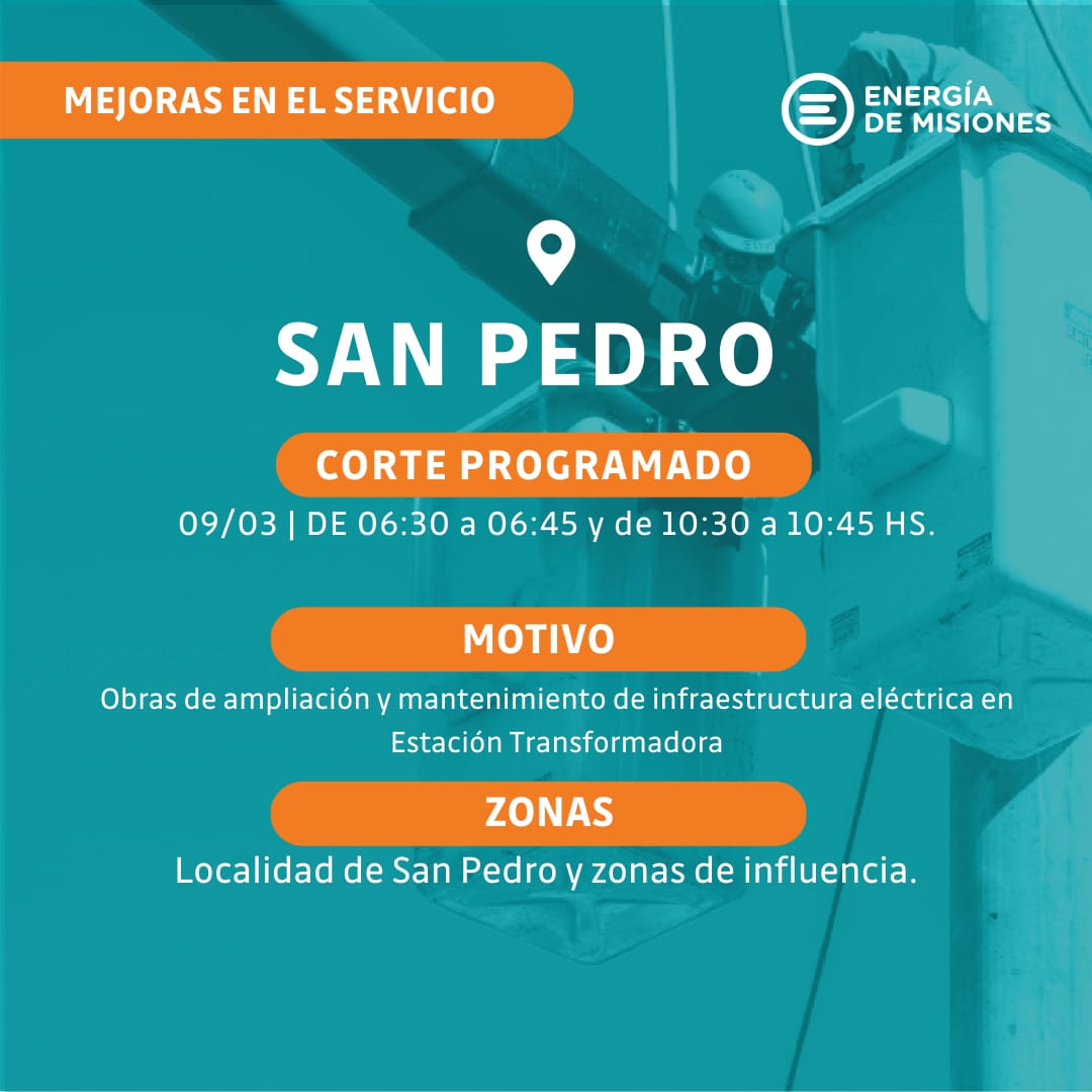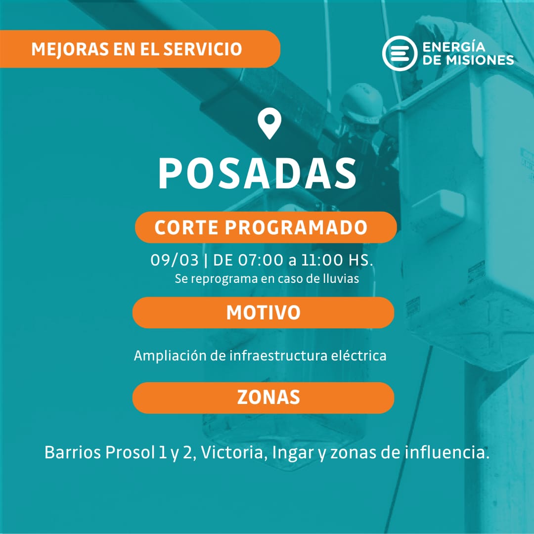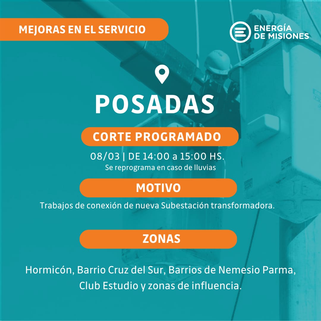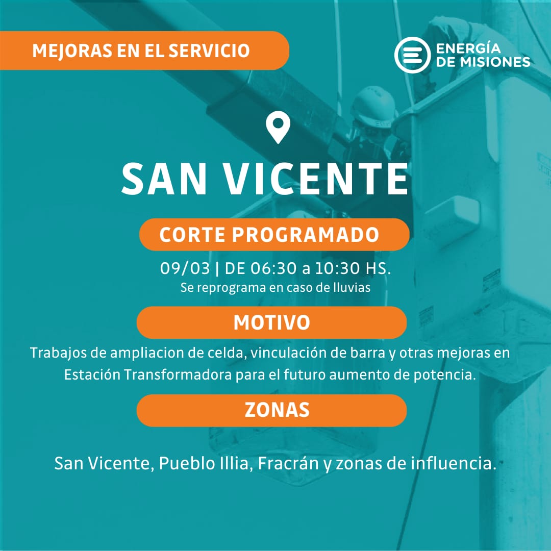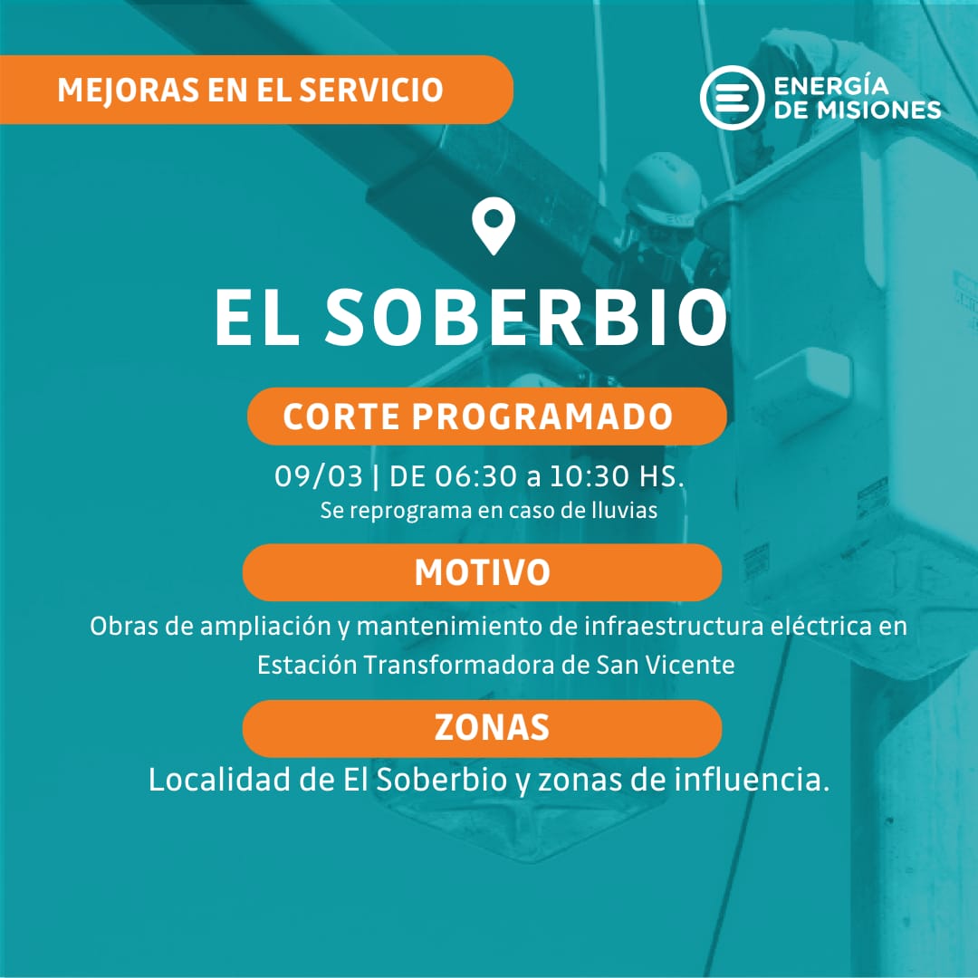 - El Soberbio: 09/03, de 06:30 a 10:30, por obras de ampliación y mantenimiento en la estación transformadora de San Vicente.