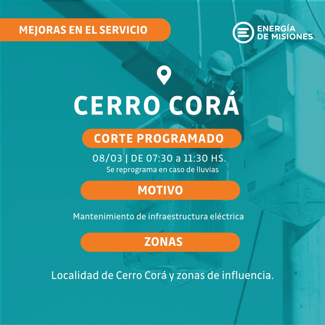 - Cerro Corá: 08/03, de 07:30 a 11:30, por mantenimiento de infraestructura eléctrica.