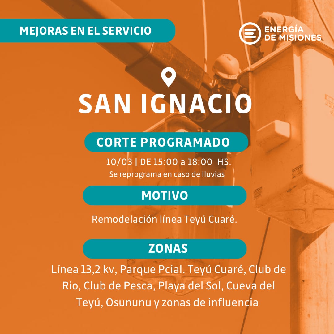 - San Ignacio: 10/03, de 15:00 a 18:00, por remodelación de la línea Teyú Cuaré.