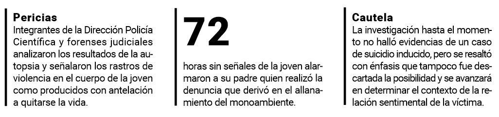 De acuerdo a fuentes judiciales consultadas por PRIMERA EDICIÓN, se estableció que el suicidio no remite controversia por varios puntos resaltados: la puerta del inmueble estaba cerrada desde adentro y los detalles del mecanismo para quitarse la vida no remitían a la intervención directa de otras personas tampoco.