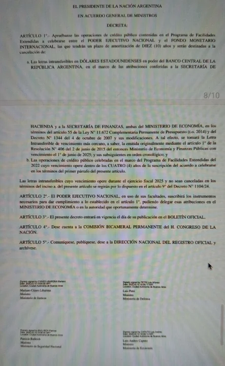 El presidente Javier Milei firmó hoy el DNU del acuerdo con el Fondo Monetario Internacional y el gobierno espera que la oposición no logre frenarlo en el Congreso, para lo cual necesitaría reunir votos en Diputados y en el Senado.