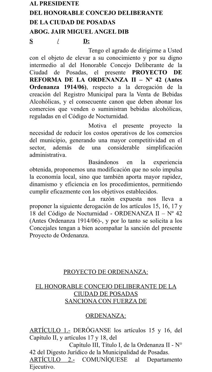 En el camino de simplificar y agilizar trámites para favorecer el desarrollo comercial y la creación de nuevos comercios en Posadas, se presentó un proyecto para derogar algunos artículos de la Ordenanza II N° 42 que refiere a la habilitación de expendio de bebidas alcohólicas y al canon que deben pagar los comerciantes para hacerse del certificado que los habilita para tal fin.