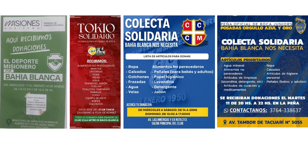 Desde el Gobierno provincial se inició una campaña denominada “El deporte misionero con Bahía Blanca” donde distintos clubes de la tierra colorada están recibiendo donativos que serán enviados a la localidad bonaerense afectada. Sin embargo no son los únicos puntos que actualmente están intentando dar una mano al pueblo bahiense. Acá te mostramos dónde acercarte y con quién comunicarte.
