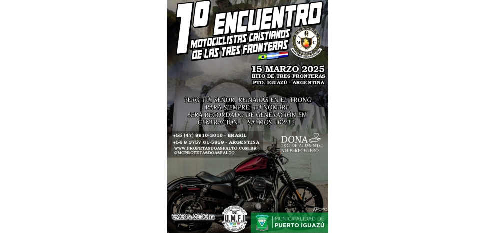 El próximo 15 de marzo, Puerto Iguazú será sede del Primer Encuentro de Motociclistas Cristianos de las Tres Fronteras, un evento que reunirá a motociclistas de Argentina, Brasil y Paraguay. El encuentro tendrá lugar en el Hito de las Tres Fronteras a partir de las 9 y está organizado por el grupo Profetas del Asfalto. Con esta actividad, el objetivo es “reforzar la importancia de la espiritualidad en el motociclismo y la presencia de Dios en la vida de los participantes”.