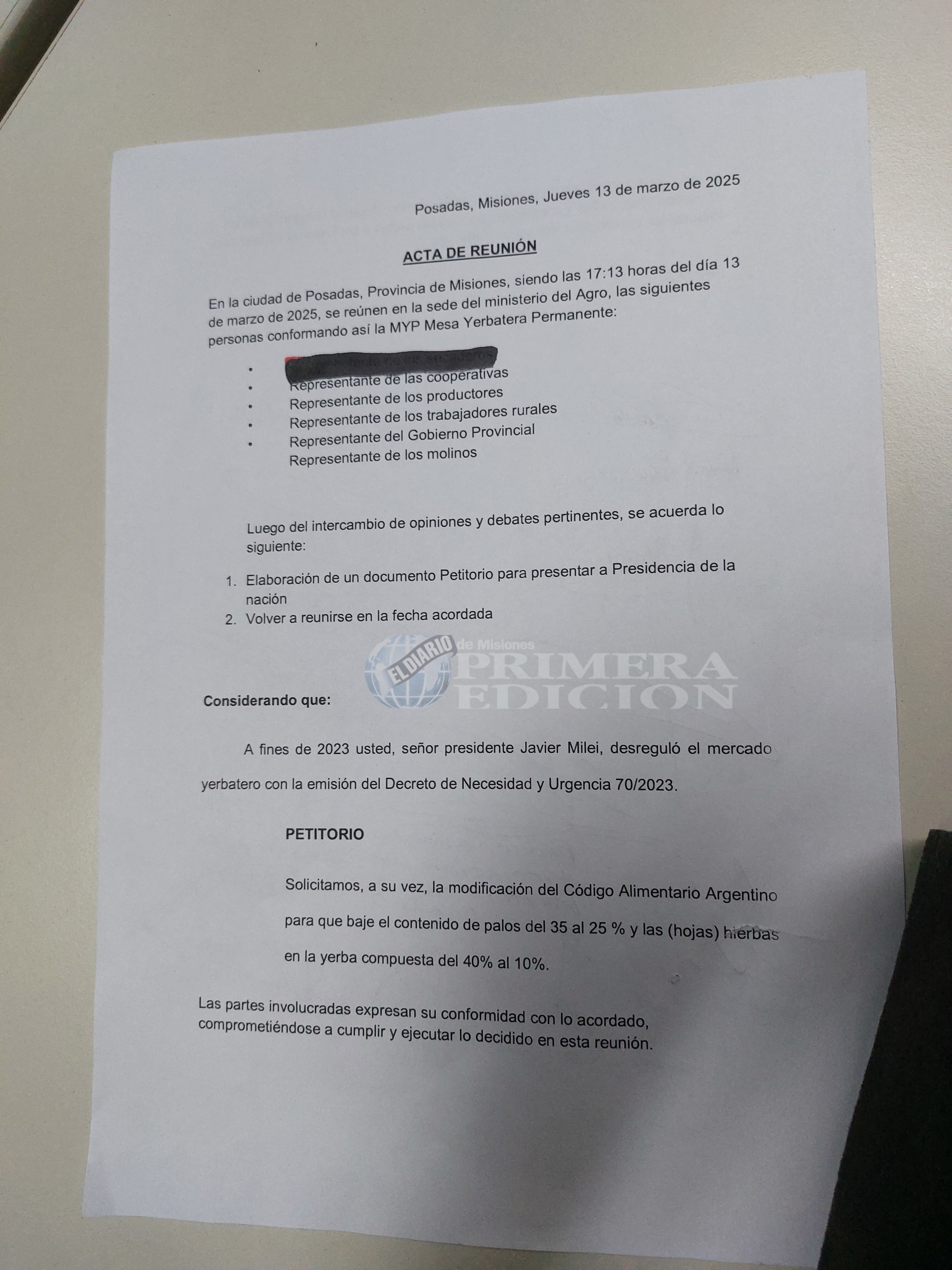 Entre las solicitudes acordadas, se pedirá al Gobierno de Javier Milei modificar el Código Alimentario Argentino para reducir el contenido de palos en la yerba mate del 35% al 25% y disminuir las hojas hierbas en la yerba compuesta del 40% al 10%.