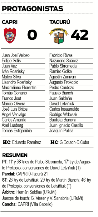 Una clara y resonante victoria alcanzó ayer Tacurú en su visita a CAPRI, al imponerse en Villa Cabello por un contundente 42-0 en el inicio del Torneo Integración de rugby, organizado en forma conjunta por las Uniones de Misiones (URuMi) y Paraguay (URP).