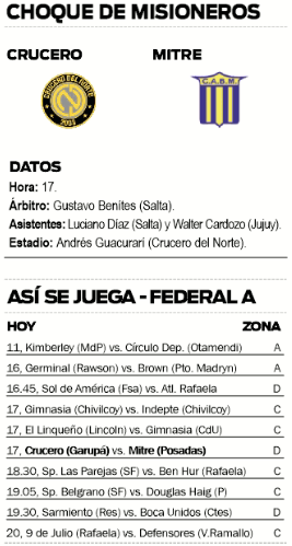 Terminó la espera y llegó el momento de jugar. Crucero del Norte y Bartolomé Mitre están listos parta llevar adelante hoy un partido sin precedentes ya que por primera vez se enfrentarán en una categoría nacional, en este caso, el Torneo Federal A.