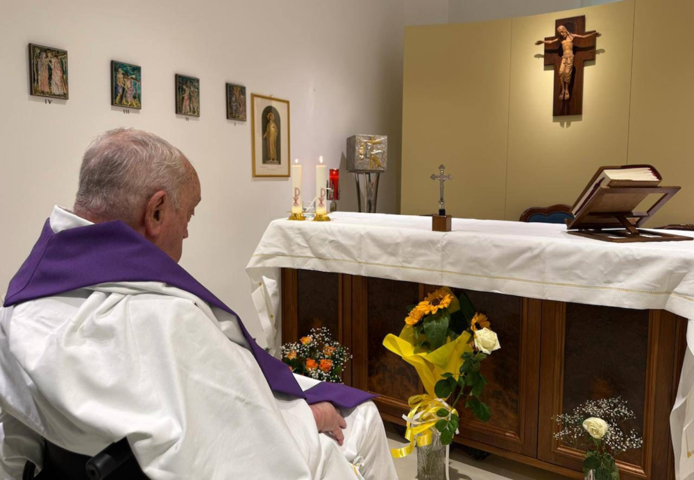 Este domingo el Vaticano difundió la primera foto del papa Francisco desde su internación. Se ve al jesuita argentino de 88 años sentado ante el altar de su capilla privada en el hospital Gemelli de Roma. “Esta mañana, el papa Francisco ha concelebrado la santa misa en la capilla del apartamento de la décima planta del policlínico Gemelli”, explica la Santa Sede.