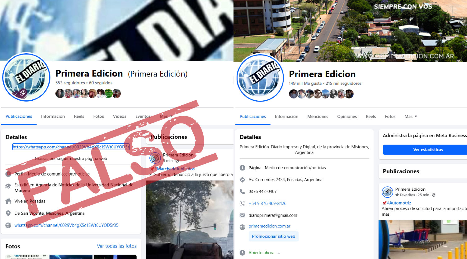 Dicho página imitadora tiene uno de los logos (viejo) de este diario en su foto de perfil y otra distinta en su portada; y además cuenta con 556 seguidores en total; contrariamente, la página de Facebook de PRIMERA EDICIÓN cuenta 215 mil seguidores, tiene el link hacia la página web (primeraedición.com.ar) y suma los teléfonos (fijo y celular) del medio donde comunicarse.