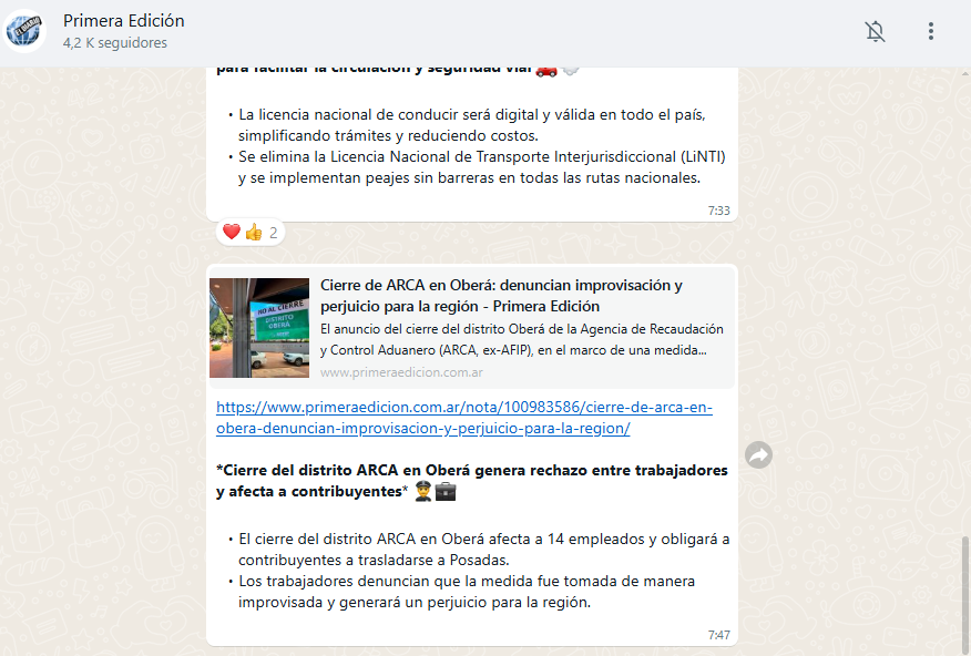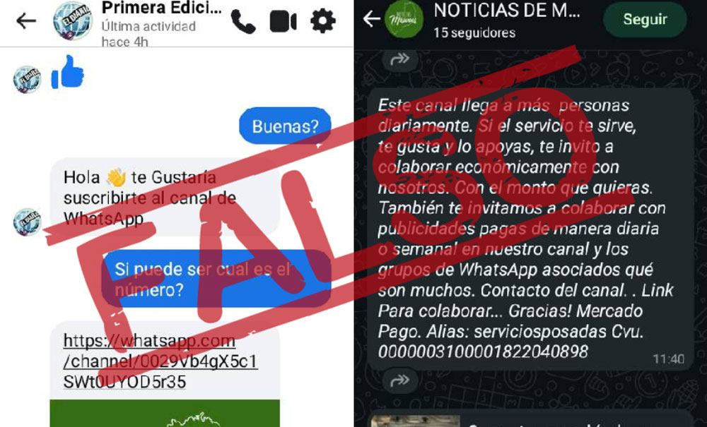 Es necesario aclarar que el diario PRIMERA EDICIÓN NO solicita aportes económicos por ninguna red social o de mensajería y NADA tiene que ver con el canal de Whatsapp “Noticias de Misiones”, donde se deja un CBU y se pide una colaboración. Es un fraude.