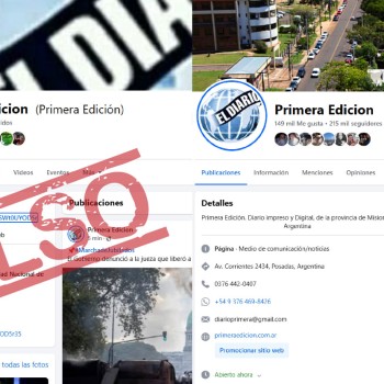 Dicha página de Facebook imitadora tiene uno de los logos (viejo) de este diario en su foto de perfil y además cuenta con 556 seguidores en total; contrariamente, la página de Facebook de PRIMERA EDICIÓN cuenta 215 mil seguidores, tiene el link hacia la página web (primeraedición.com.ar) y suma los teléfonos (fijo y celular) del medio donde comunicarse y corroborar su legitimidad.