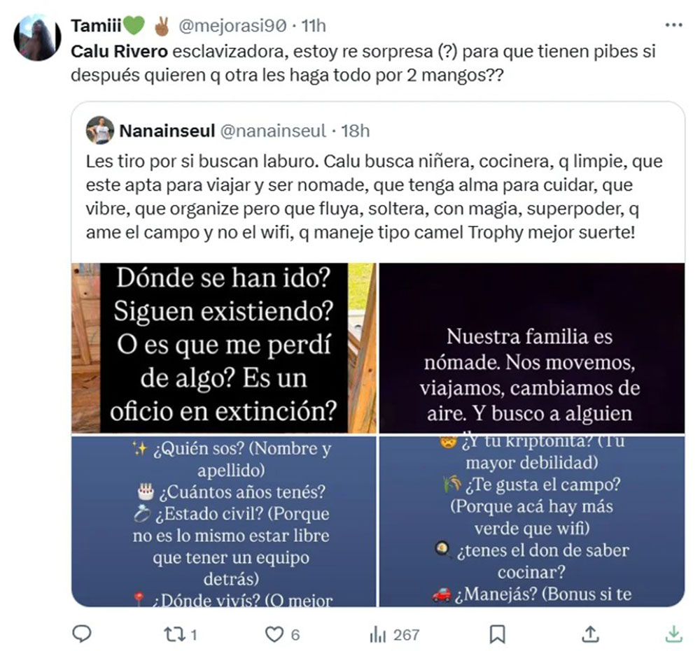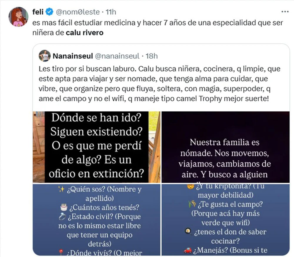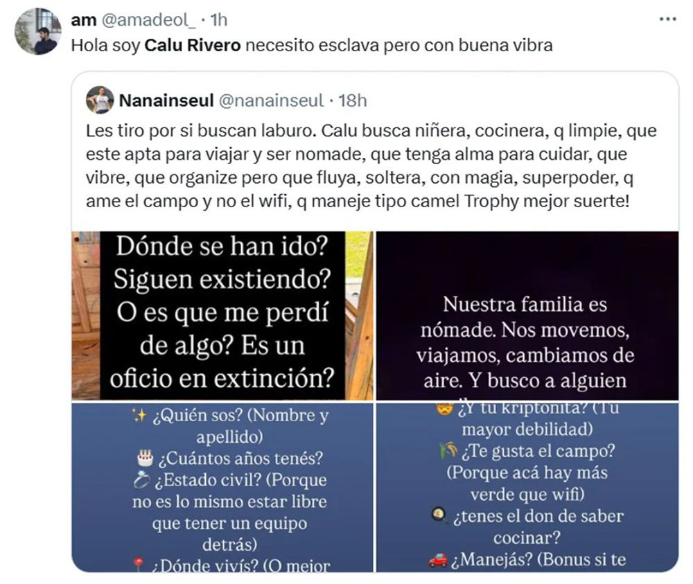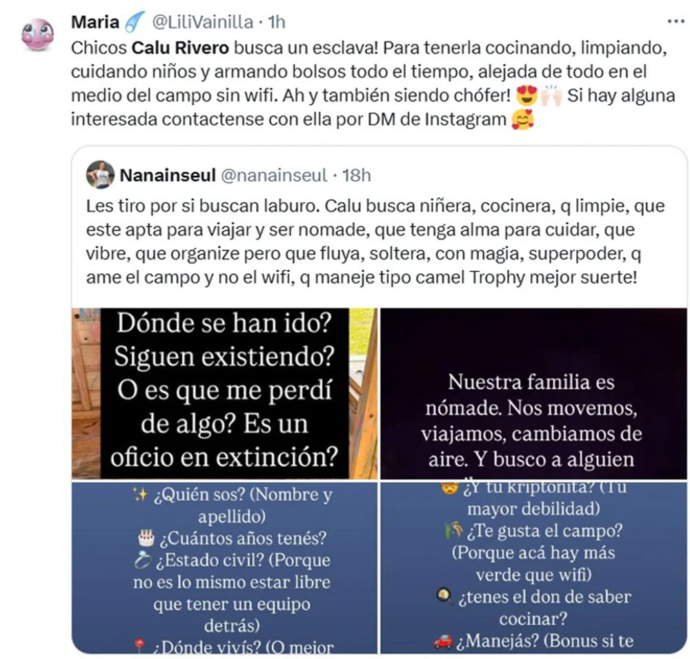 Calu Rivero volvió a tomar relevancia en las últimas horas tras realizar un extraño anuncio público en su cuenta de Instagram: busca una niñera nómade que la acompañe en la crianza de sus hijos. La manera elegida de búsqueda fue cuestionada por los usuarios de las redes sociales, quienes viralizaron sus requisitos.