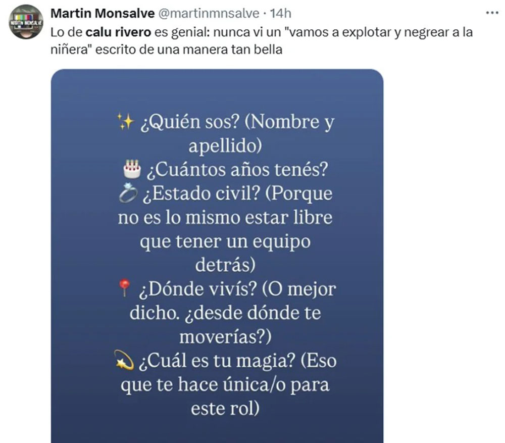 “Estoy buscando una niñera, pero no cualquier niñera, no alguien que ‘le guste estar con niños’ nomás. Busco a esa persona que entienda el arte de cuidar, de acompañar, de sostener”, especificó.