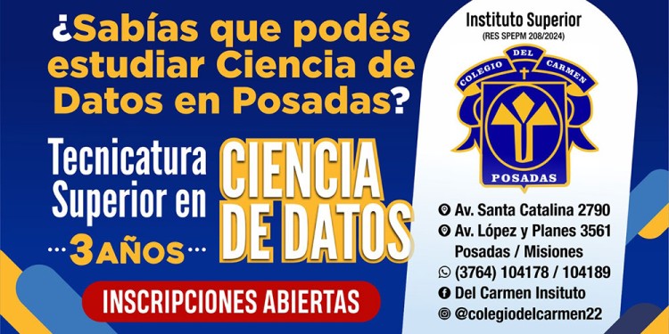 ¿Sabías que en Posadas podés formarte en Ciencia de Datos? El Instituto Superior Colegio del Carmen ofrece la Tecnicatura en Ciencia de Datos, una carrera corta con excelentes oportunidades laborales. Con una modalidad de cursada presencial y una duración de 3 años, obtendrás un título que te permitirá integrarte rápidamente al mundo laboral. ¡Esta es la oportunidad de construir tu futuro con las herramientas necesarias!